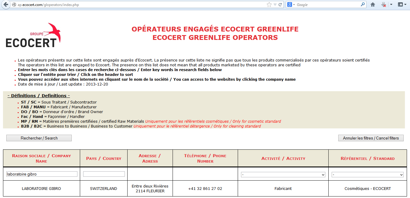 Gibro was certified an organic manufacturer by Ecocert® / Cosmebio® in 2007 as manufacturer of organic certified products and ecologically-minded manufacturing practices. |