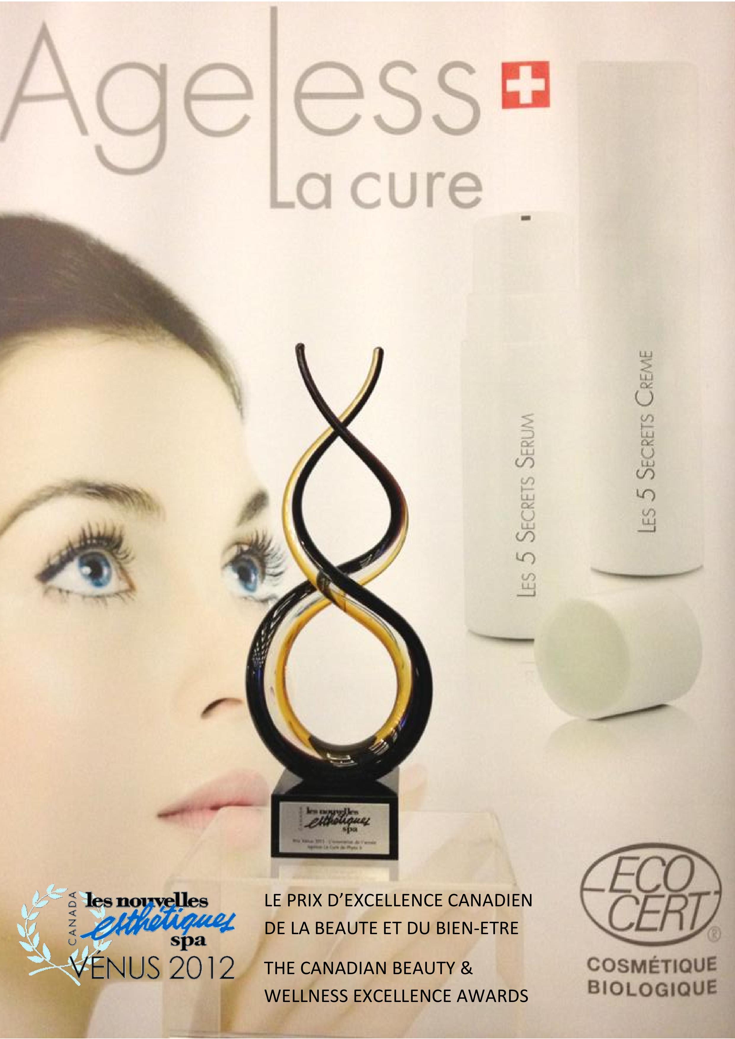 The parent company PHYTO 5 received the "Best product in all categories" prize for Innovation for the Ageless La Cure Serum & Cream kit in 2013 from "Les Nouvelles Esthetiques Spa Canada." We have been awarded the trophy for more than 10 years development of this new product line.